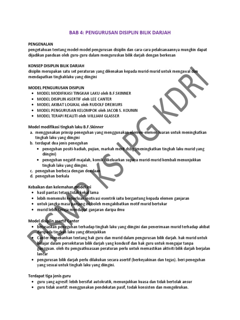 Disiplin merupakan satu set peraturan yang dikenakan kepada murid-murid untuk mengawal dan mendapatkan tingkahlaku yang diingini. Pengurusan bilik darjah merujuk kepada kebolehan guru mengawal murid-murid bagi memastikan proses PP berjalan dengan lancar. 07122011 pengetahuan tentang model-model pengurusan disiplin dan cara-cara pelaksanaannya mungkin dapat dijadikan panduan oleh guru-guru dalam menguruskan bilik darjah dengan berkesan KONSEP DISIPLIN BILIK DARJAH disiplin merupakan satu set peraturan yang dikenakan kepada murid-murid untuk mengawal dan mendapatkan tingkahlaku yang diingini.