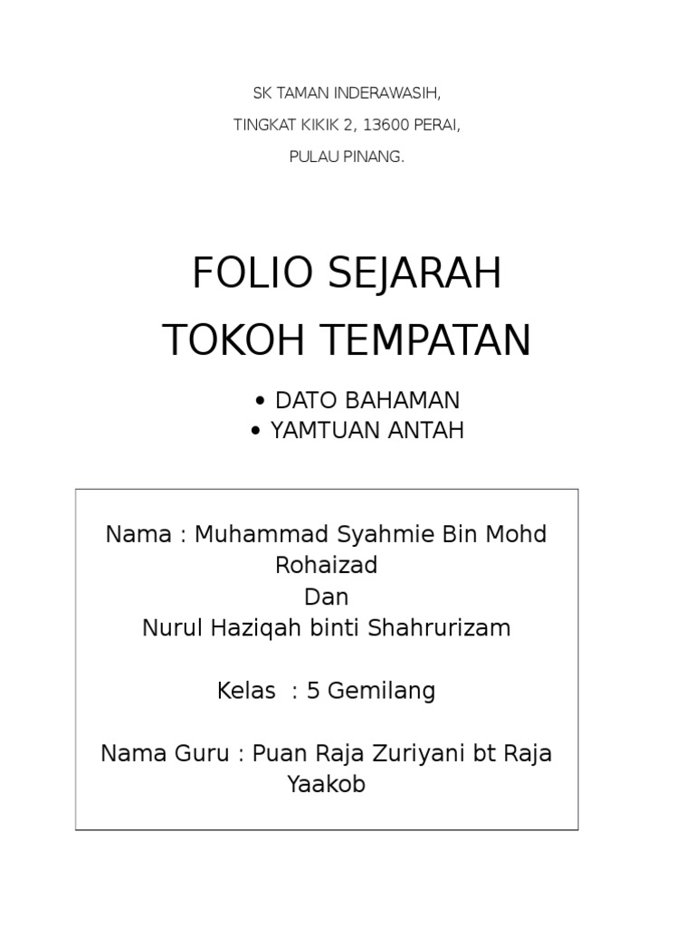 Folio tokoh tempatan darjah 5. Tajuk ini memberi pendedahan tentang campur tangan kuasa luar dan penjajahan yang menyebabkan penentangan dan perjuangan tokoh tempatan yang menjadi inspirasi kepada anak bangsa untuk menuntut kemerdekaan negara kita. Banyak ilmu yang saya dapat sepanjang tempoh menyiapkan tugasan. Projek sejarah tahun 4 buku skrap tokoh terbilang pada 14 8 2017 jumlah.