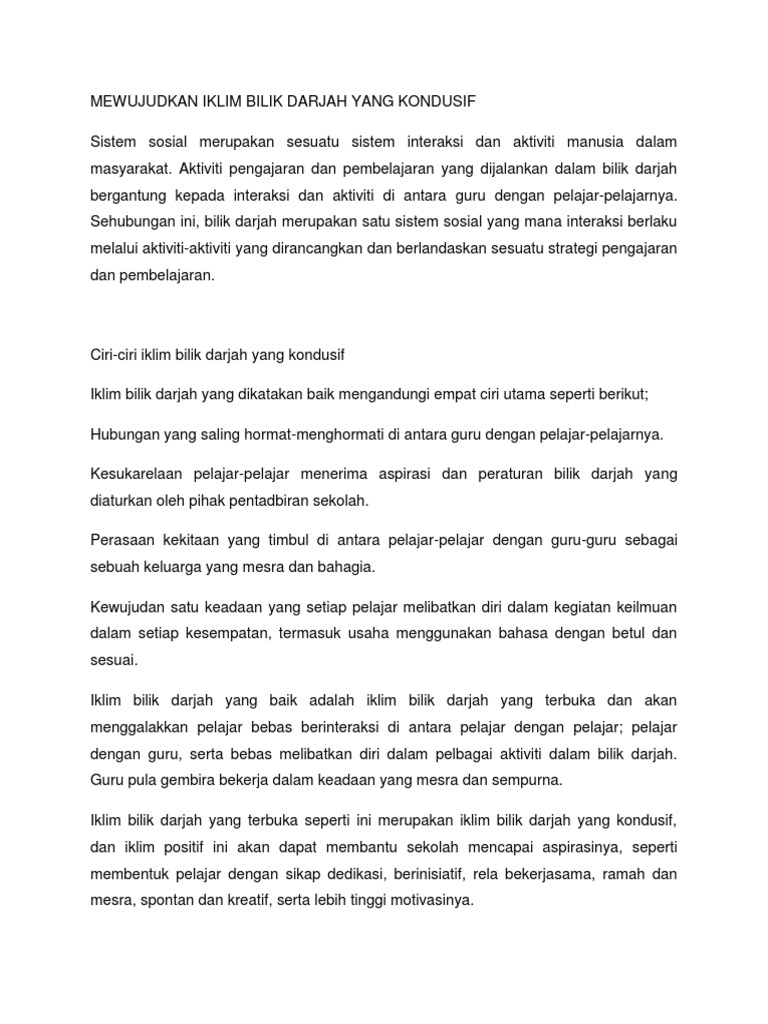 Definisi bilik darjah yang kondusif. Bilik darjah yang mempunyai pelajar-pelajar yang bertingkah laku baik menjadikan tugas pengajaran guru one of the most wonderful jobs in the world kerana setiap hari guru mengalami pelbagai pengalaman yang baru dan berbeza di bilik darjah. Aktiviti pengajaran dan pembelajaran yang dijalankan dalam bilik darjah bergantung kepada interaksi dan aktiviti di. MEWUJUDKAN IKLIM BILIK DARJAH YANG KONDUSIF Sistem sosial merupakan sesuatu sistem interaksi dan aktiviti manusia dalam masyarakat.