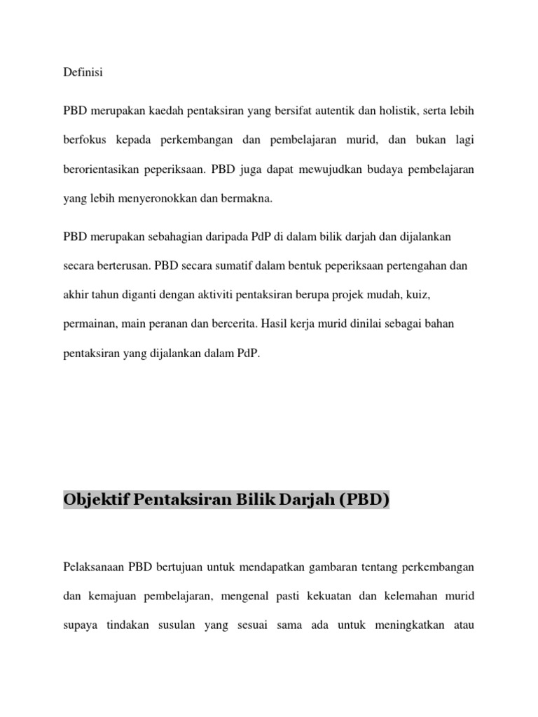 - mengesan perkembangan murid secara menyeluruh. PBD lebih bersifat formatif iaitu mengutamakan kemajuan setiap murid dan membantu guru membuat diagnostik bagi mengesan perkembangan pembelajaran. PBD merupakan kaedah pentaksiran yang bersifat autentik dan holistik serta lebih berfokus kepada perkembangan dan pembelajaran murid dan bukan lagi berorientasikan peperiksaan.
